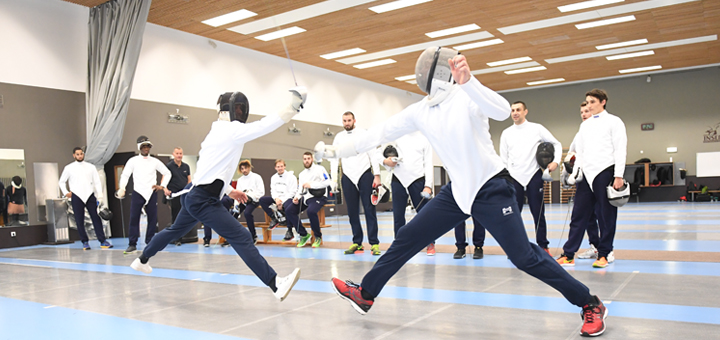 Venus découvrir les joies du handball lors des premiers jours de janvier, les escrimeurs de l’équipe de France se sont, à leur tour, pliés en 4 pour accueillir les Rouge et Noir au cœur de l’INSEP, dans le pavillon d’Oriola dédié à la pratique de cet « art martial » à la française. Après quelques échauffements de circonstance, menés par Robin Hager, fils de Daniel et préparateur physique des escrimeurs, les pensionnaires de Delaune ont pu commencer à prendre leurs marques. Sous la houlette des entraineurs nationaux, Jean-Philippe Daurelle en tête, ils ont ensuite appris les spécificités de l’arme du jour : touches valables au dessus de la ceinture, en coupant, avec pour ambition de prendre l’avantage pour réussir à scorer. Après quelques petits jeux pour débuter, bien vite, plastrons enfilés, casques vissés et sabres à la main, les « combats » ont commencé. D’abord avec simple touche à la tête, puis sur toute la zone définie. On voyait François-Xavier Chapon à l’aise… comme dans quasiment toutes les disciplines sportives possibles. Rémy Gervelas était aussi au rendez-vous tout comme Benjamin Bataille ou Léo Martinez. Autre match qui valait son pesant d’or, l’affrontement entre Micke Brasseleur et Mahamadou Keïta ! Sobre comme sur le terrain, le demi-centre Vasja Furlan n’a, de son côté, pas fait que porter beau la tenue du jour : « Ça a été un très bon moment car je rêvais vraiment d’essayer cette discipline. 1h30, cela fait vraiment court pour se sentir à l’aise et pouvoir transposer ses qualités. J’ai pu faire jouer un peu mon jeu de jambe mais pour la vista, c’était moins le cas. (rires) On a été parfaitement accueilli par le staff de l’équipe de France, à l’INSEP qui possède de très belles installations. On a été très chanceux. »